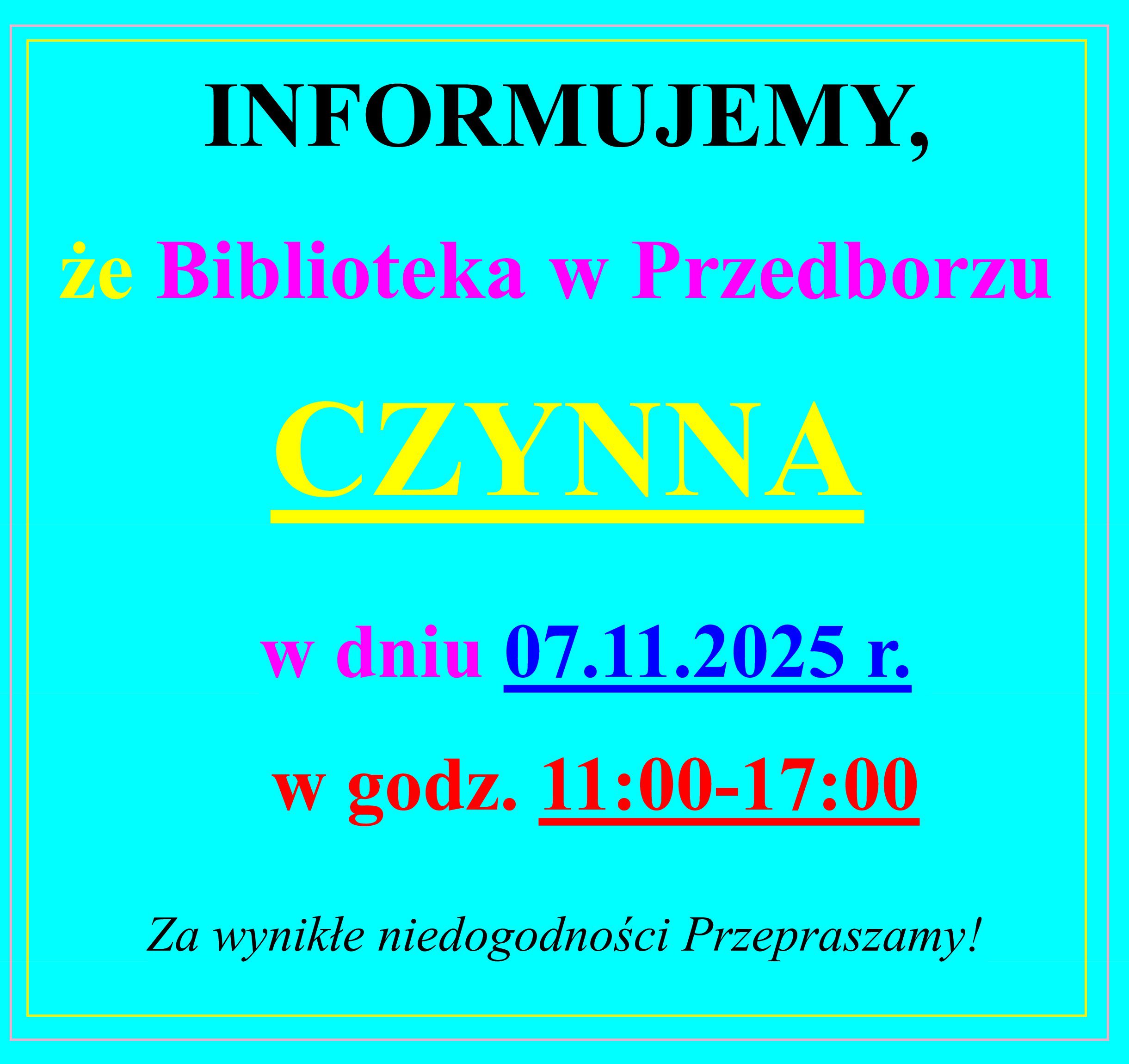 INFORMUJEMY, że Biblioteka w Przedborzu w dniu 07.11.2025 r. CZYNNA w godz. 11:00-17:00 Za wynikłe niedogodności Przepraszamy!
