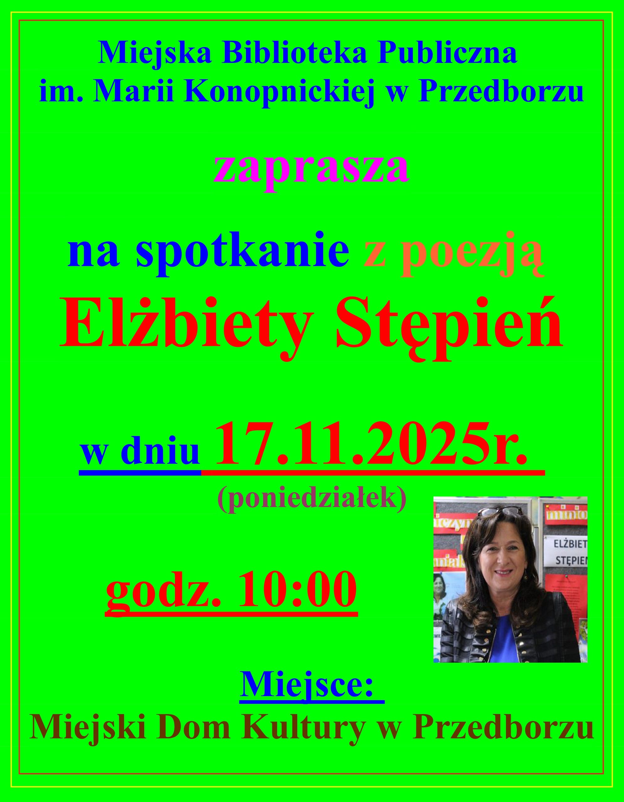 Zapraszamy Was serdecznie w dniu 17.11.2025r. (poniedziałek) na godz. 10:00 do Miejskiego Domu Kultury w Przedborzu na spotkanie z poezją Elżbiety Stępień. Zapowiada się niezwykle ciekawe spotkanie