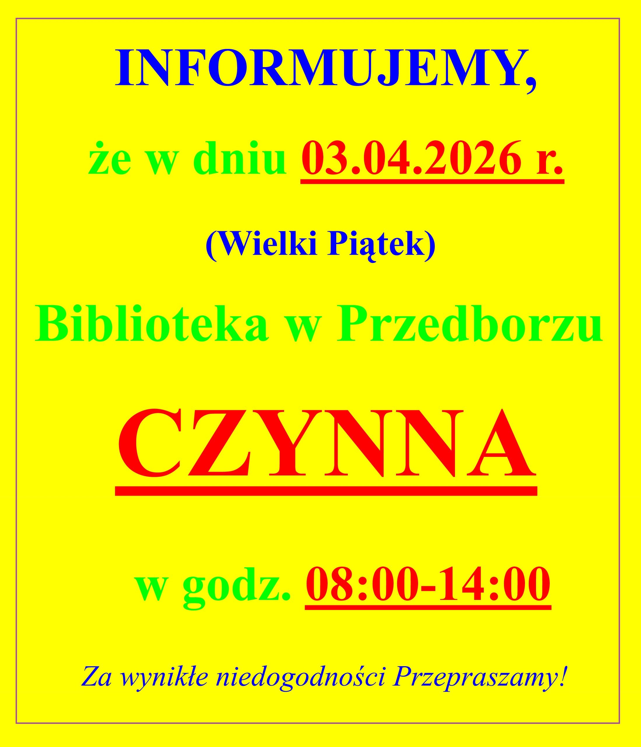 INFORMUJEMY, że w dniu 03.04.2026 r. (Wielki Piątek) Biblioteka w Przedborzu CZYNNA w godz. 08:00-14:00 Za wynikłe niedogodności Przepraszamy!