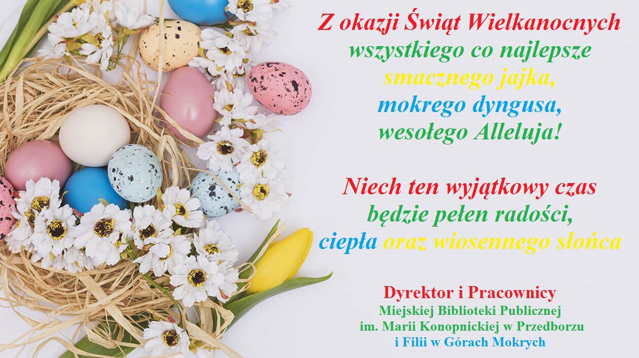 Z okazji Świąt Wielkanocnych wszystkiego co najlepsze smacznego jajka, mokrego dyngusa, wesołego Alleluja! 🙂 Niech ten wyjątkowy czas będzie pełen radości, ciepła oraz wiosennego słońca 🙂 Dyrektor i Pracownicy Miejskiej Biblioteki Publicznej im. Marii Konopnickiej w Przedborzu i Filii w Górach Mokrych