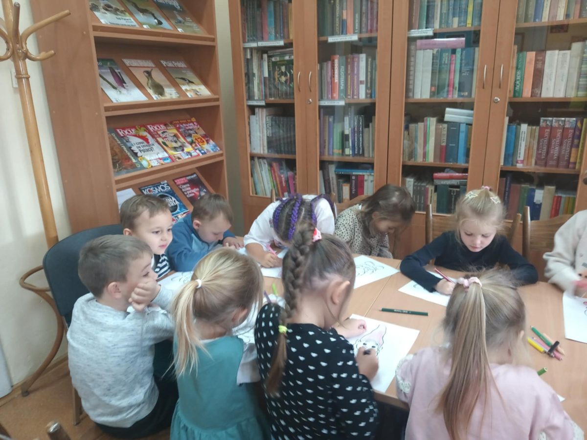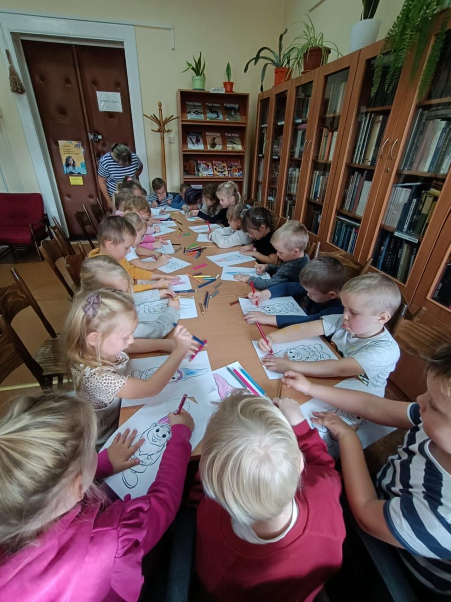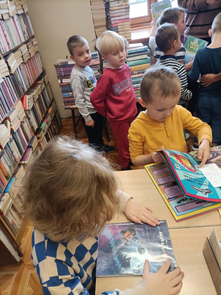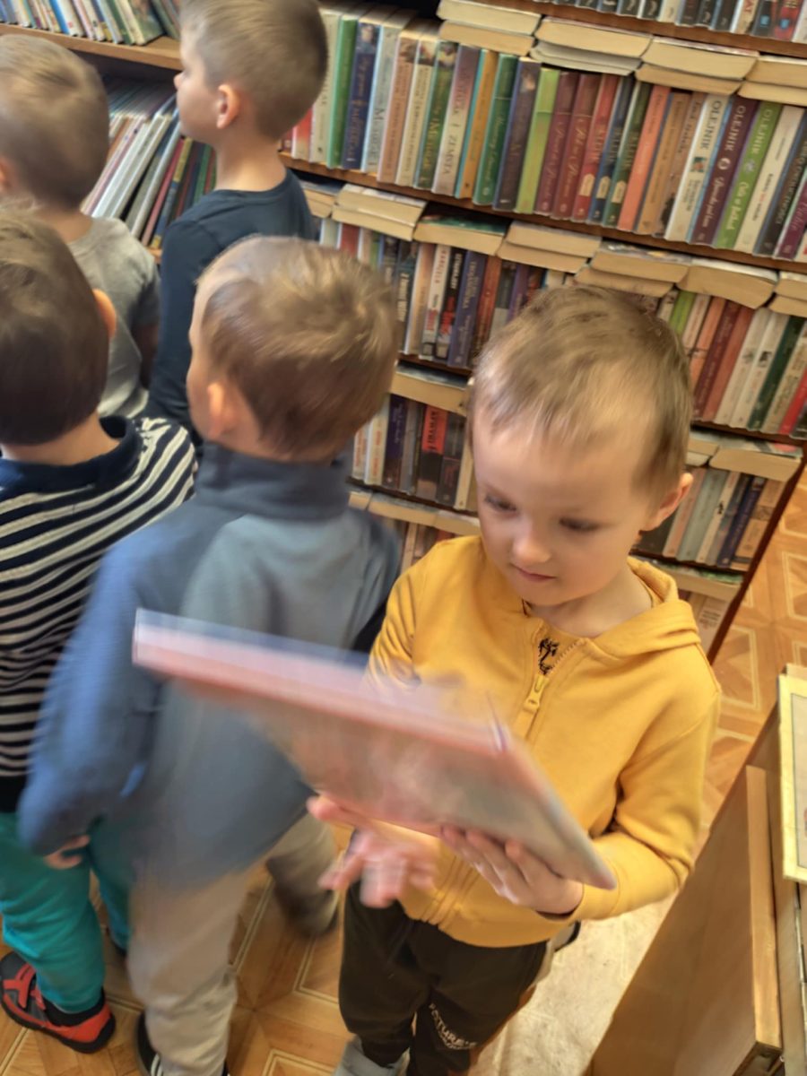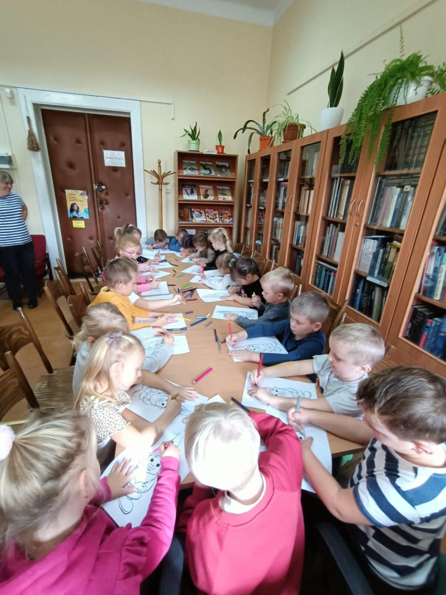 Dzieci zwiedziły bibliotekę, zapoznały się z posiadanym księgozbiorem oraz pokolorowały malowankę z krasnalem.