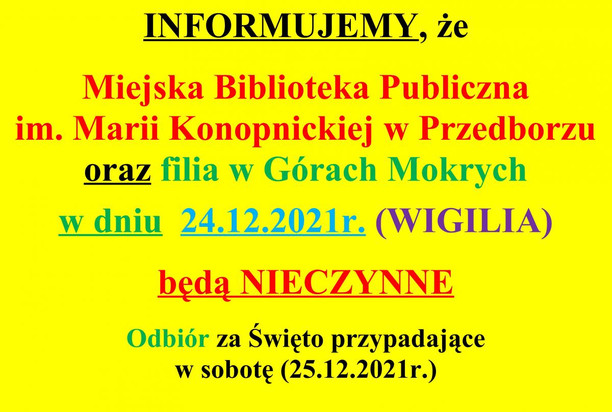 INFORMUJEMY, że Miejska Biblioteka Publiczna im. Marii Konopnickiej w Przedborzu oraz filia w Górach Mokrych w dniu 24.12.2021r. (WIGILIA) będą NIECZYNNE. Odbiór za Święto przypadające w sobotę (25.12.2021r.)